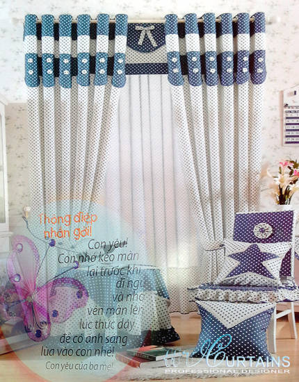 Rèm trẻ em 15. Là sản phẩm rèm viền trắng chấm bi xanh rất đẹp mà không quá màu mè, rất thích hợp trang trí cho phòng bé trai nhà bạn.